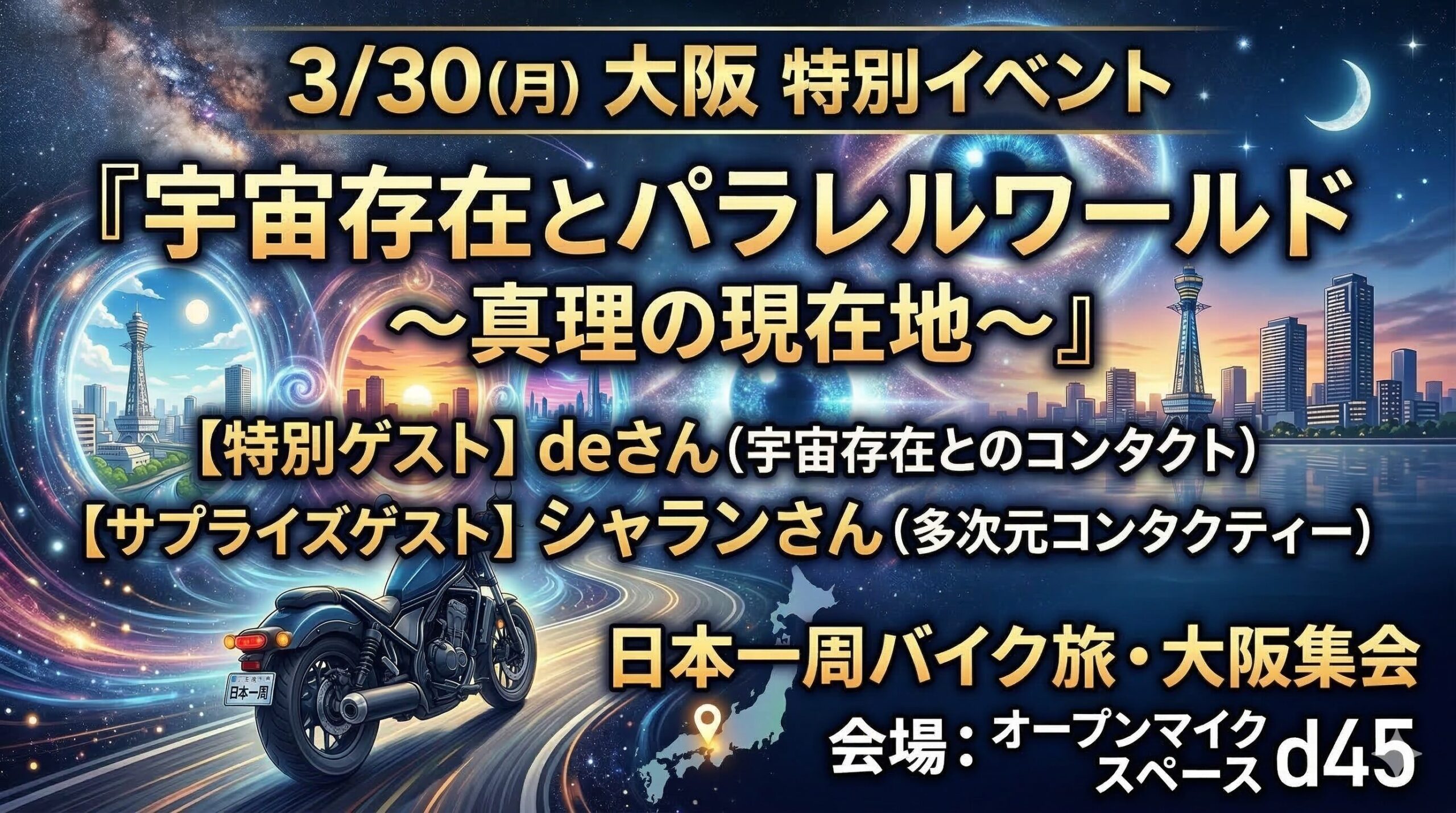 【3/30 大阪特別イベント】日本一周バイク旅・特別企画!deさん&シャランさんと深める真理の探求